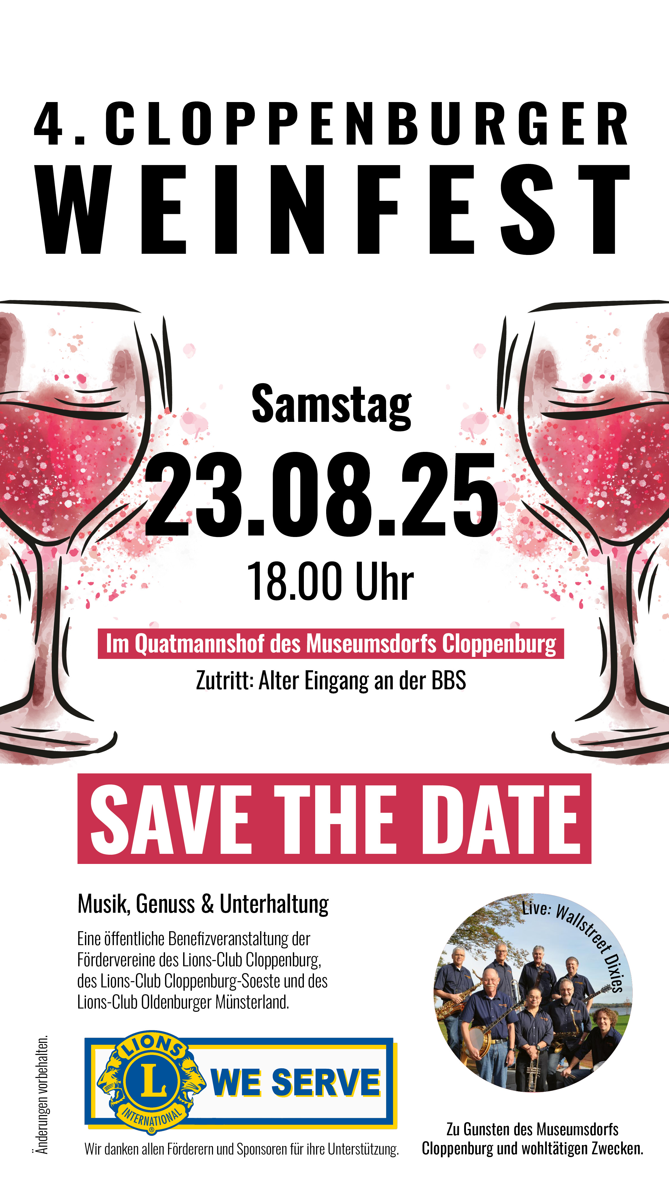 Gemeinsam laden die drei Fördervereine der Lions-Clubs Cloppenburg, Cloppenburg-Soeste und Oldenburger Münsterland zum 2. Cloppenburger Weinfest am 02. September ab 18 Uhr in das Museumsdorf Cloppenburg ein.