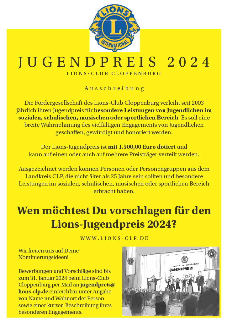 Die Fördergesellschaft des Lions Club Cloppenburg vergibt seit dem Jahr 2003 – anlässlich unserer 40jährigen Charterfeier initiiert – jährlich einen Jugendpreis für besondere Leistungen von Jugendlichen im sozialen, schulischen, musischen oder sportlichen Bereich. Dieser ist mit 1.500,00 Euro dotiert und kann auf mehrere Preisträger verteilt werden.