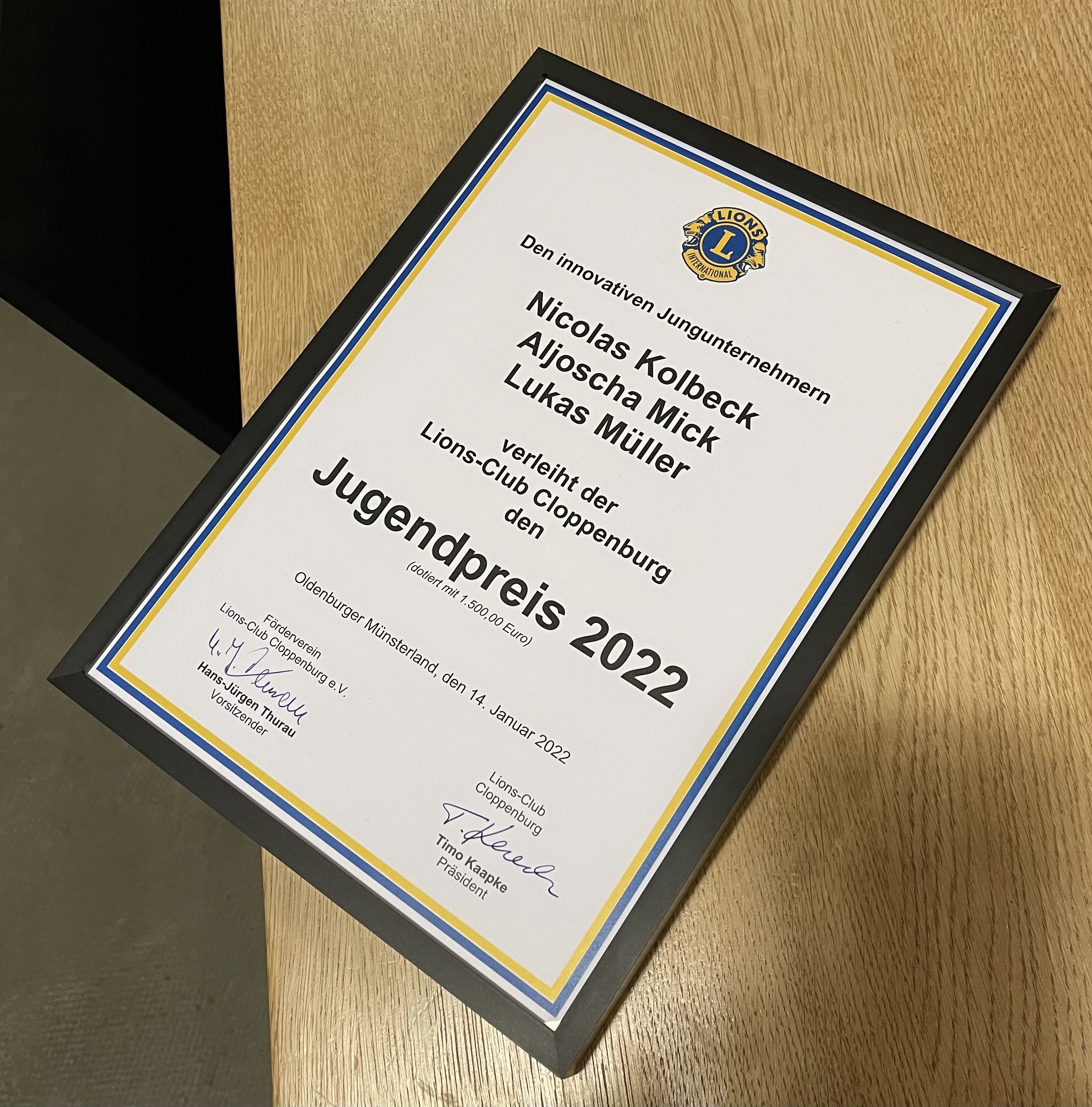 Zum 15. Mal seit 2003 verlieh der Lions-Club Cloppenburg nun seinen Jugendpreis. Der Club ehrt dieses Jahr die Schüler des Cloppenburger ULF Nicolas Kolbeck, Aljoscha Mick und Lukas Müller für ihr besonderes unternehmerisches Engagement. Sie haben eine innovative Geschäftsidee zur Digitalisierung von Gebissabdrücken, die bislang noch physisch in Zahnarztpraxen aufbewahrt werden, entwickelt. Damit waren sie bei zahlreichen nationalen Gründerwettbewerben erfolgreich.
